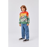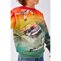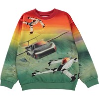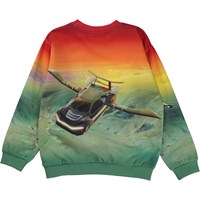 Miksi er en rød, gul og grøn sweatshirt med et gennemgående print på både for og bagside af en flyvende bil og rumskib. Sweatshirten har ribkant ved hals, ærmer og hofte.