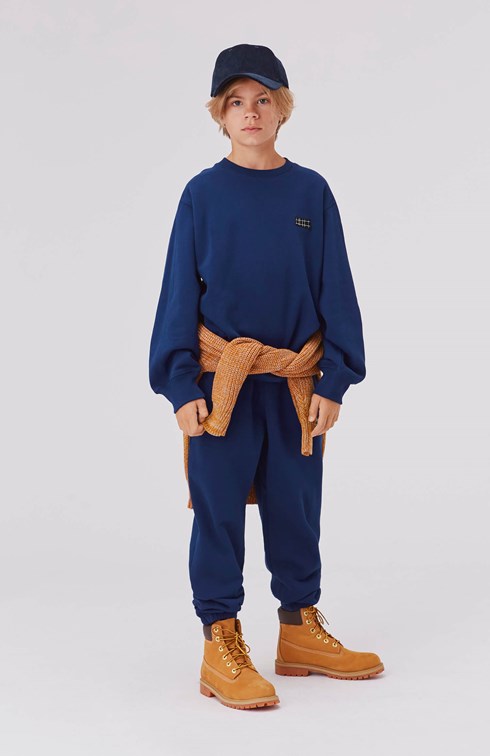 Mir er en blå sweatshirt med Molo logo på det ene bryst. Kombiner sweatshirten med matchende sweatpants.