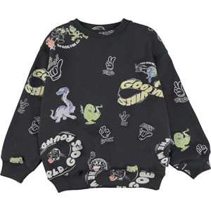 Monti er en sort sweatshirt med forskelligt print af tekst og håndtegn.