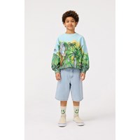 Lyseblå sweatshirt i blødt økologisk bomuld med ribkanter ved hals, ærmer og i bunden af blusen. Sweatshirten har en løs pasform med aliens og ufoer, der er landet i den grønne jungle.