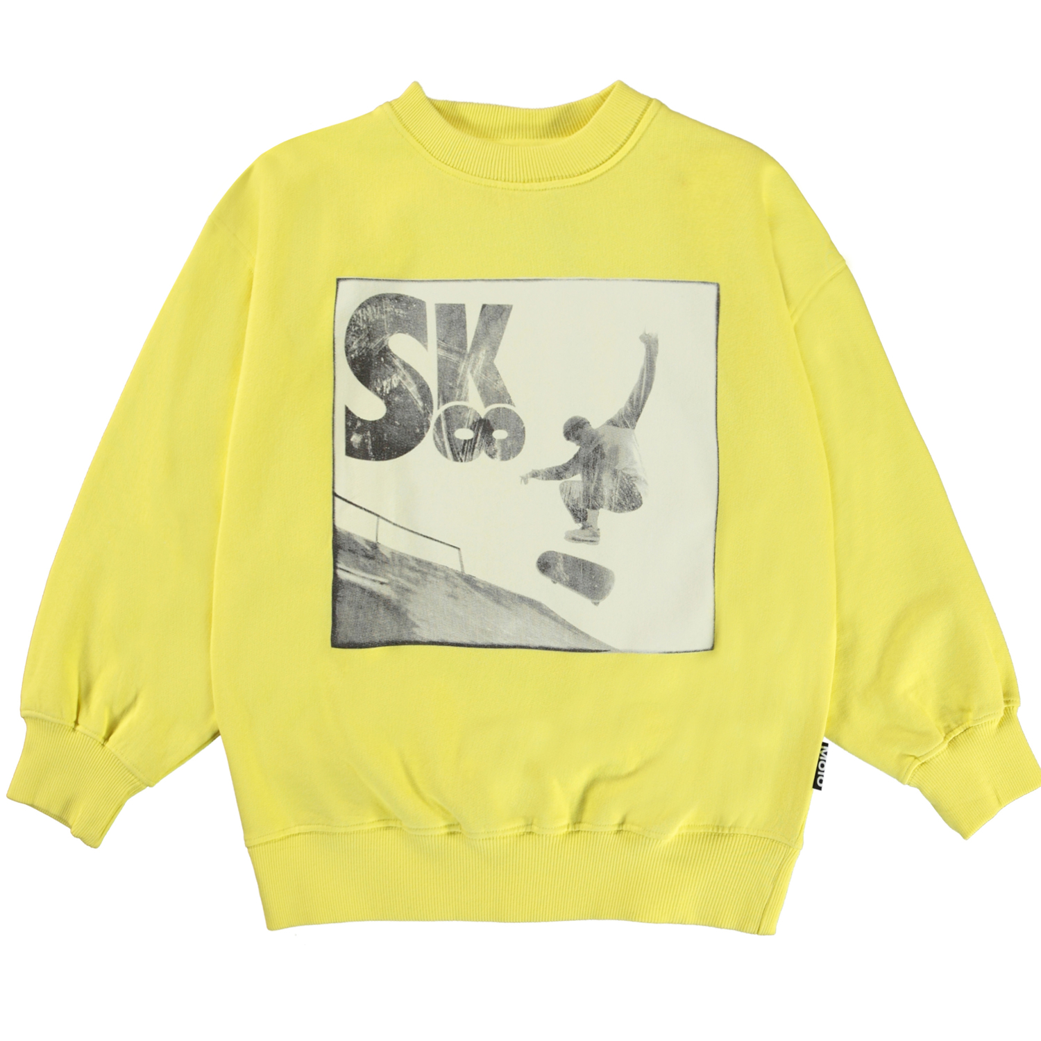 Monti er en gul sweatshirt med printet "SK8" i sort/hvid på fronten. Monti har rib ved både hals, håndled og hofte.