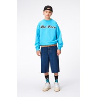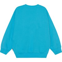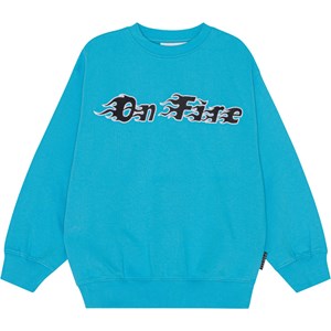 Turkis sweatshirt med et sort og hvidt frontbroderi i økologisk bomuld. Når noget bliver rigtig varmt, brænder det ikke rødt, men hvidt. Broderiet her består af teksten "On Fire" skrevet med flammende bogstaver i sort og hvid hen over brystet. Monti har en rund halsudskæring med ribkant, ribkant ved hofte og ærmer, samt en løs pasform.