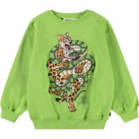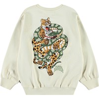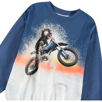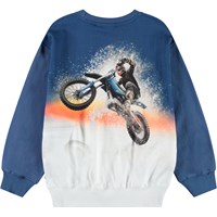 Blå og hvid sweatshirt i blødt økologisk bomuld med ribkanter ved hals, ærmer og i bunden af blusen. Sweatshirten har en løs pasform med front- og bagprint af en motocrosskører, der laver en wheelie.