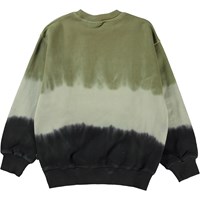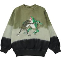 Monti er en sweatshirt med dip dye print i grøn, beige og sort med print af en brydekamp mellem to frøer i bastskørter. Sweatshirten har ribkant ved hals, bund og ærmeafslutning. Fuldend looket med de matchende bukser, Alvar.