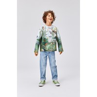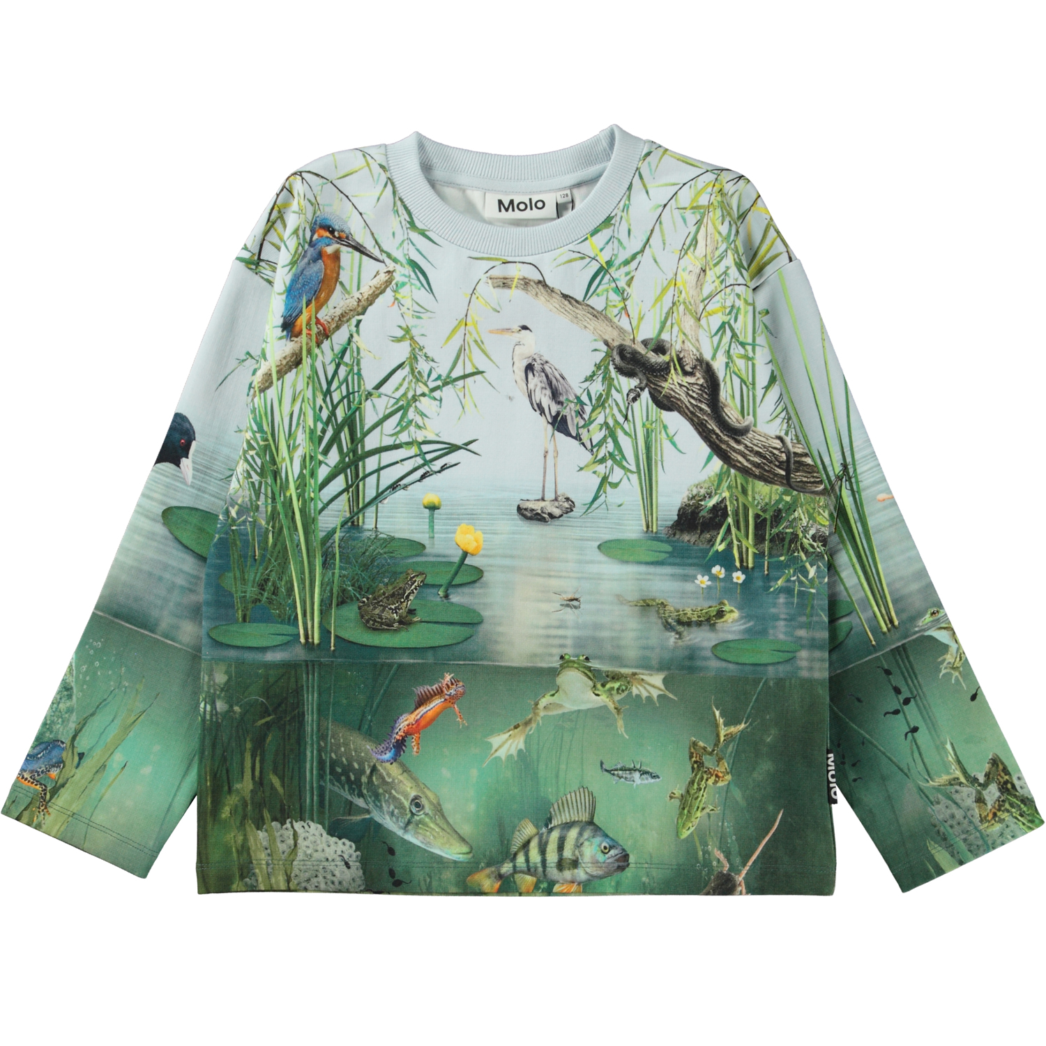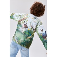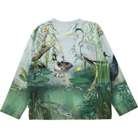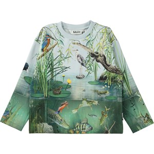 Mountoo er en blå og grøn bluse med gennemgående print på både ærmer, for og bagside af en lille dam og dyrere, som lever der.