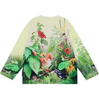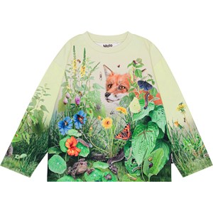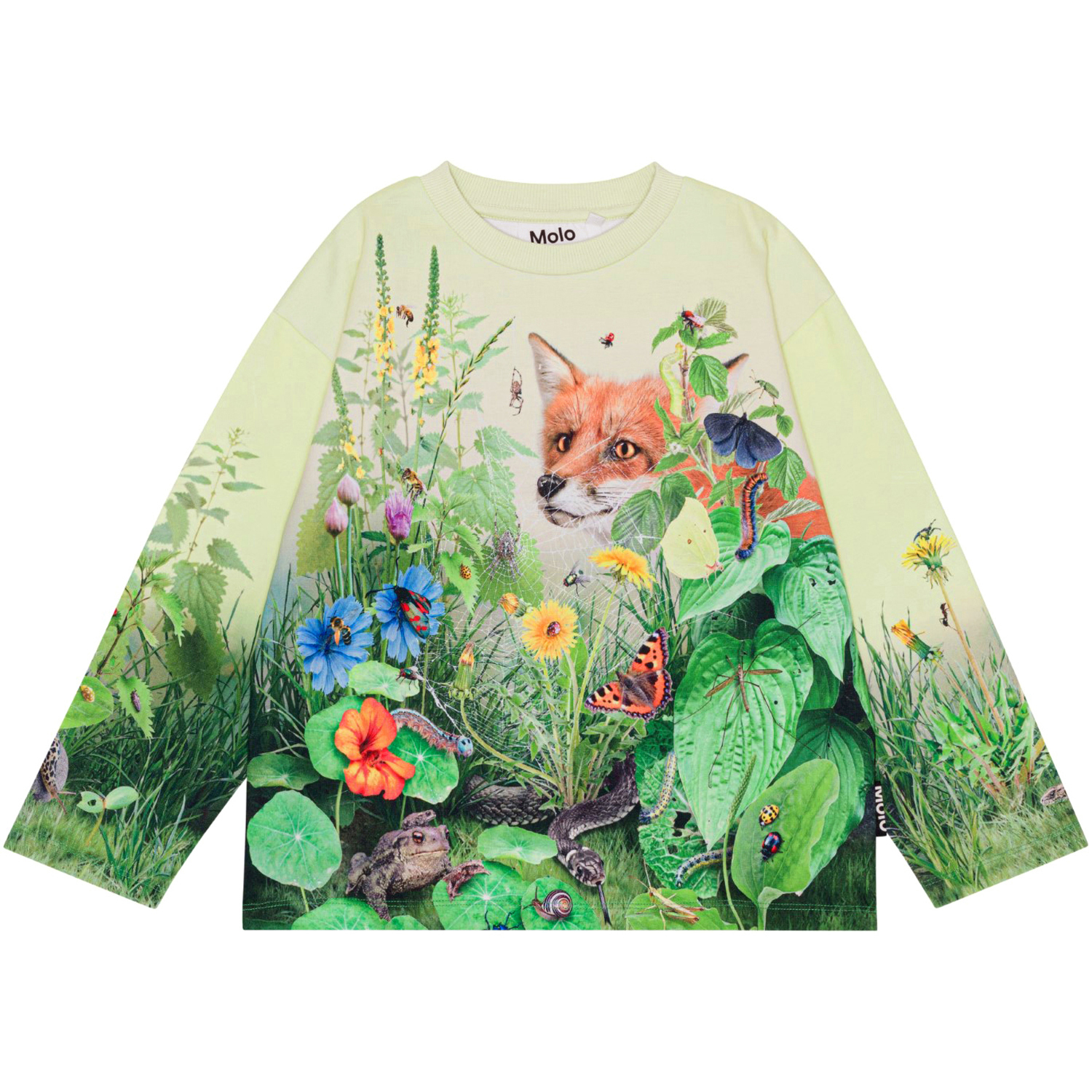 Grøn økologisk sweatshirt med farverigt placeret naturprint. her kan du gå på opdagelse og se hvor mange dyr du kan finde. Trøjen har en normal pasform og en rund halsudskæring med ribkant.