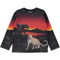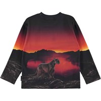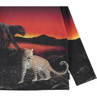 På blusen Mountoo i printet "Wild Lake", er både panteren og leoparden ved at gøre sig klar til nattens jagt, men de sidder ved søens brted i solnedgangen. Mountoo har rib i halsen og er løs ved håndled og hofte.