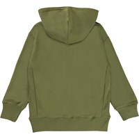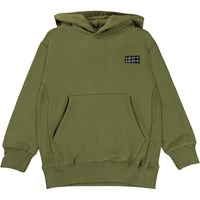 Moz er en grøn hoodie med kængurulomme på maven og sort logo patch i venstre side. Moz har rib ved håndled og hofte.
