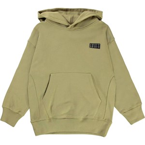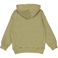 Moz er en støvet grøn sweatshirt hoodie med lommer på maven og sort logo patch i venstre side. Moz har rib ved håndled og hofte.