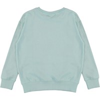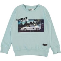 Murphy er en lyseblå sweatshirt med print af bil og palmer på fronten, samt teksten 'Sunset Drive'. Sweatshirten har rund hals og elastisk ribkant ved bund og ærmeafslutning. Certificeret af Ecocert Greenlife, certifikationsnr. 197496.