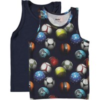 Pakke med to bomulds undertrøjer. Den ene er blå og den anden har print af forskellige fodbolde.