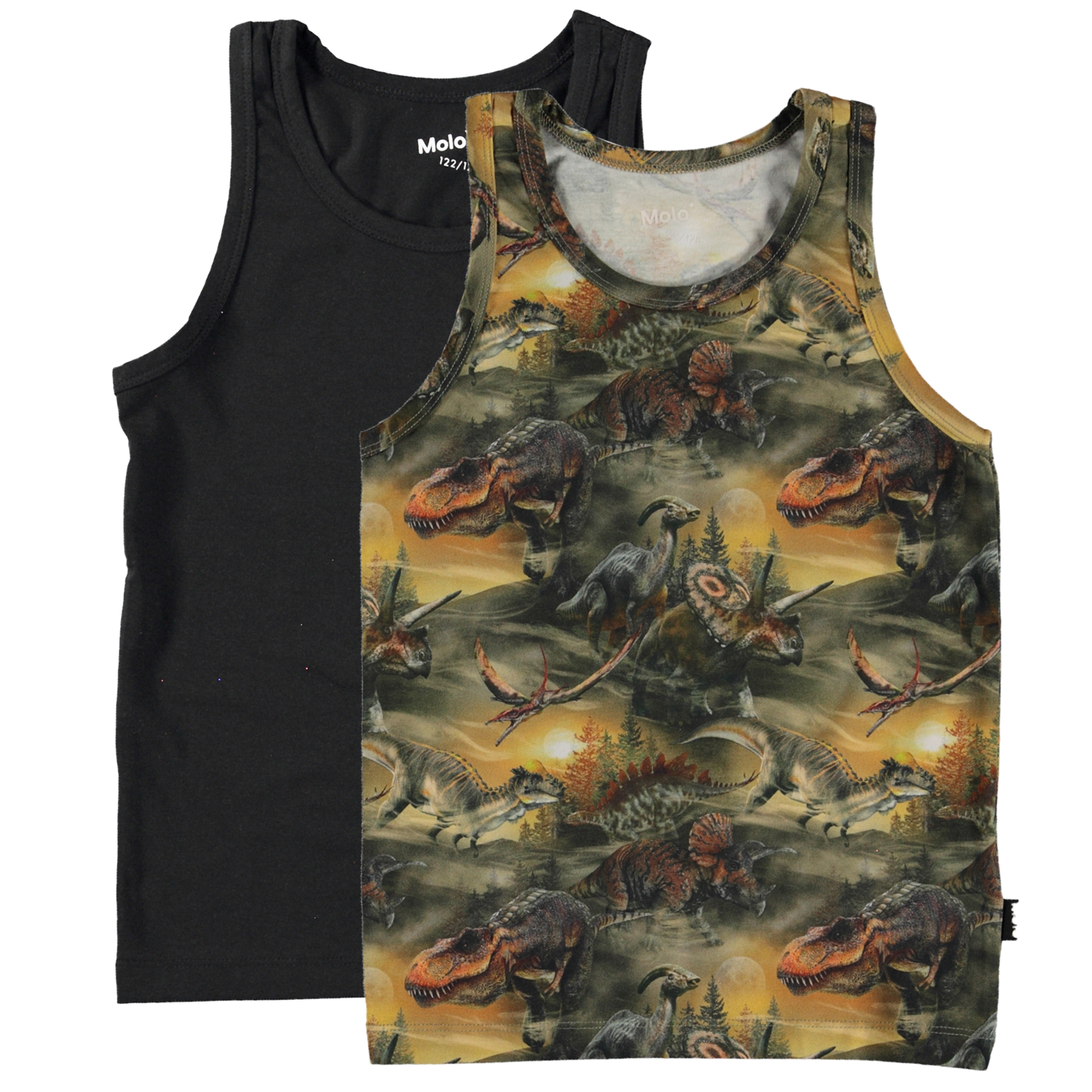 2-pack af vores populære Jayden undertrøjer. Denne version indeholder en sort og en med allover dinoprint. På printet ses mange forskellige dinosaurer, vandrende rund i sandklitterne, i disen lige før morgengry. Over dem ses omridset at månen, der husker dem på at de er en del af noget større. Undertrøjerne er fremstillet i 100% blød bomuld med stretch, der gør det rart at have på og gør det muligt at kunne bevæge sig frit uden restriktioner. Match evt. denne 2-pack med vores Justin 2-pack, der indeholder matchende underbukser.