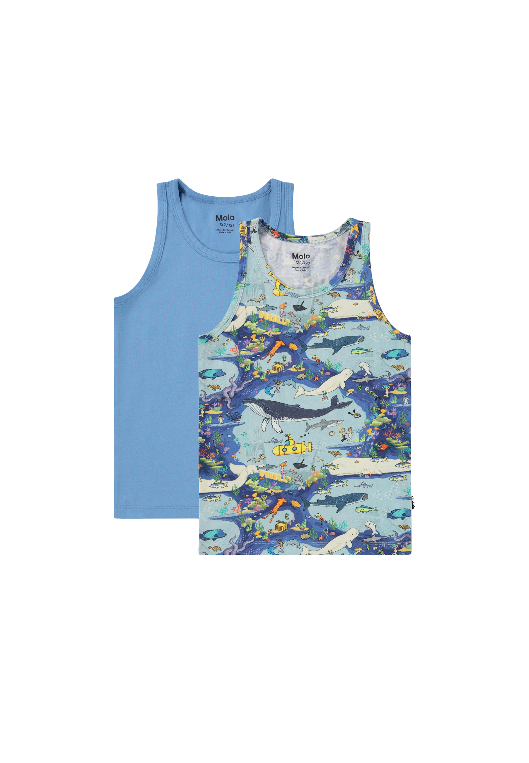 2-pak undertrøjer med brede stropper og rund hals i blød økologisk bomuld. Pakken indeholder en blå samt en med print af havets dyr og sjove figurer.
