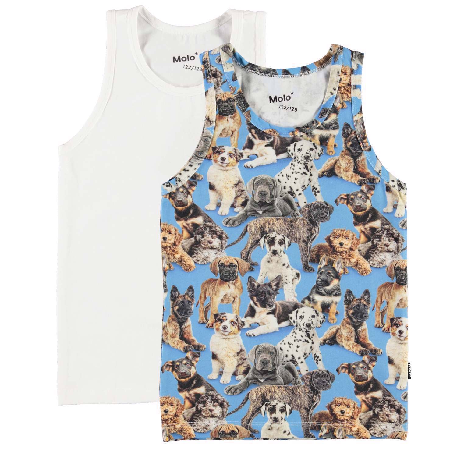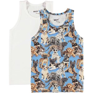 Jayden 2-pack har ikke én, men to tank tops - en i hvid og en med et all-over print med de sødeste hundehvalpe. Molo logo er printet i kontrastfarve i nakken.