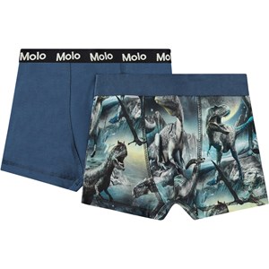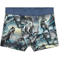 2-pak boxershorts i økologisk bomuld. Pakken indeholder et par mørkeblå boxershorts og et par med et alloverprint af dinosaurer.