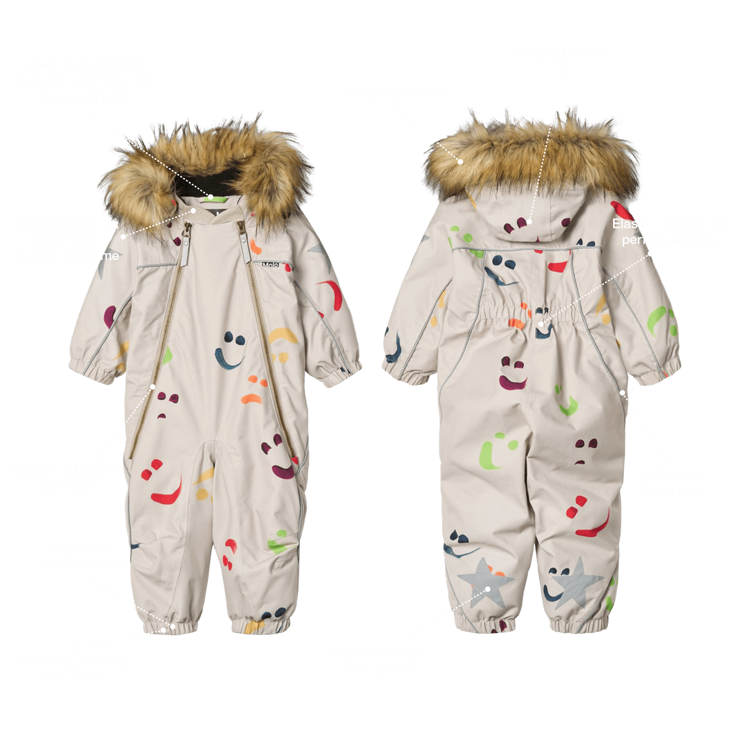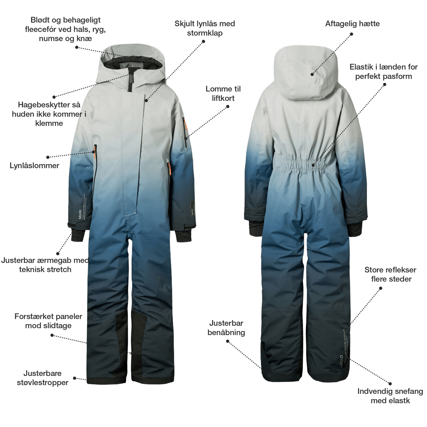 Molos flyverdragter er varme, vind- og vandtætte samt meget åndbare. De er polstret med 3M™ Thinsulate™, som er let og meget effektivt i sin isoleringsevne. Polstringen holder på kropsvarmen og lader samtidig fugt slippe ud, så barnet ikke bliver fugtigt, når temperaturen svinger eller aktivitetsniveauet er højt.