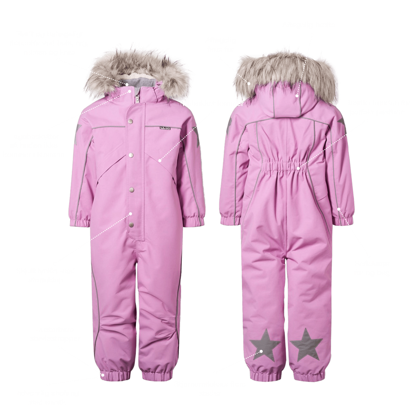 Denne flyverdragt har mange praktiske funktioner, herunder en aftagelig hætte, snefang ved benåbningerne, aftagelige støvlestropper og et elastisk panel i lænden for at sikre en behagelig pasform. De ikoniske Molo stjernereflekser på overarmene og bagsiden af benene, sammen med den reflekterende piping, giver høj synlighed i mørket. 3M™ Thinsulate™ polstringen giver Pyxis flyverdragten enestående varme samtidig med, at kroppen kan ånde. Derudover har flyverdragter blød fleecefor ned langs ryggen og numsen, ved halsen, og ved knæene for at give ekstra isolation på områder, der er mere udsatte, især når barnet leger på jorden eller i sandkassen.