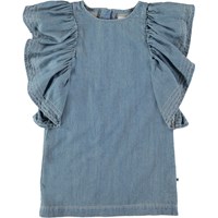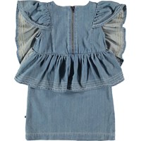 Candis er en blå denim kjole med et vasket look og store draperede ærmer. Candis har lynlås lukning i nakken.