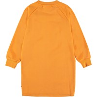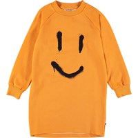 Man kan kun blive i godt humør af at kigge på kjolen Carola i orange med et stort smiley ansigt på fronten i sort. Carolen har en behagelig pasform.