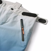 Vind- og vandtætte overtræksbukser i blå gradient farver i genanvendt polyester. Bukserne har trykknap- og lynlås lukning samt udvendige, justerbare velcro-stropper, bælte stropper til Molos seler (ekstra tilbehør) og en justerbar benåbning med snefang, samt ekstra forstærkning mellem benene. Bukserne er udstyret med vandtætte lommer, tekst bagpå med refleks effekt, som sikrer større synlighed i trafikken. Ydermere er bukserne foret med fleece udsatte steder, samt vatteret med 3M™ Thinsulate™.