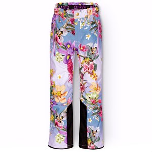 Vind- og vandtætte overtræksbukser i genanvendt polyester, med et print af smukke blomster i friske farver på en blå og lilla baggrund. Bukserne har har knap og lynlås lukning samt en indevendig justerbar elastik, bælte stropper til Molos seler (ekstra tilbehør) og en justerbar benåbning med snefang, samt ekstra forstærkning mellem benene. Bukserne er udstyret med lommer, en stor refleks bagpå, som sikre større synlighed i trafikken. Ydermere er bukserne foret med fleece udsatte steder, samt foret med 3M™ Thinsulate™, hvis lethed giver barnet en større bevægelighed.