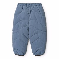 Vandafvisende mørkeblå termobukser til de mindste med brune kantbånd. Bukserne har en rummelig pasform, elastisk talje med en endevendig justerbar elastik samt en tætsluttende benåbning. Bukserne er i genanvendt polyester med en vandafvisende overflade som er fri for PFOS og PFOA. Kombiner med matchende jakke og få et varmt og blødt termosæt.