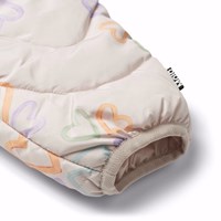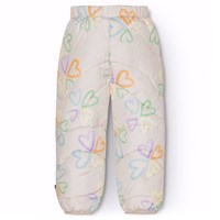 Vandafvisende pastel lilla termobukser til de mindste med kantbånd. Bukserne har en rummelig pasform, elastisk talje med en endevendig justerbar elastik samt en tætsluttende benåbning. Bukserne har et allover print af pastelfarvet akvarel malet hjerter, der former sig som kløver dannet af hjerterne. Bukser og vattering er i genanvendt polyester. Den vandafvisende overflade er fri for PFOS og PFOA.