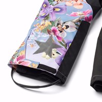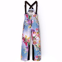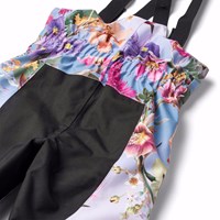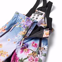 Vind- og vandtætte overtræksbukser i genanvendt polyester, med et print af smukke blomster i friske farver på en blå og lilla baggrund. Bukserne har en høj elastik talje, lynlås, justerbare seler, justerbar benåbning med snefang, samt ekstra forstærkning mellem benene. Bukserne er udstyret med lynlåslommer, en stor refleks bagpå, som sikre større synlighed i trafikken. Ydermere er bukserne foret med fleece udsatte steder, samt vatteret med 3M™ Thinsulate™.