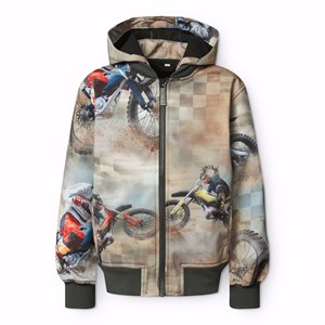 Vind- og vandafvisende softshell jakke i genanvendt polyester, med print af motocross kører i brunlige nuancer. Jakken har en aftagelig hætte, lommer i siden, vind stolpe ved lynlåsen samt ribkanter ved ærmer, krave og i bunden, der effektivt holder vinden ude.