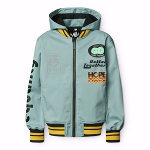 Blå vind- og vandafvisende softshell jakke i genanvendt polyester, med små print af positive udsagn og budskaber fra kollektionens temaer. Jakken har en aftagelig hætte, lommer i siden, vind stolpe ved lynlåsen samt ribkanter ved ærmer, krave og i bunden, der effektivt holder vinden ude.