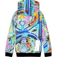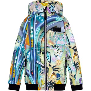 Funktionel softshell-jakke i delvist genanvendt polyester med farverigt alloverprint inspireret af en gammeldags pinball maskine. Jakken har indvendig fleeceforing, frontlynlås med hagebeskytter og indvendig overfald, aftagelig hætte, lommer med lynlås i siderne samt en stor refleks på bagsiden. Derudover er der sort elastisk rib i ærmegab og ved hofte, der sikrer, at kold luft ikke trænger ind.