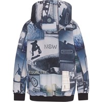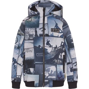 Cloudy er en sporty og vandtæt softshell jakke i blå med skater print. Cloudy har aftagelig hætte, lynlås ned langs fronten, lommer i siden samt vindfang i ærmerne og elastisk kant i bunden. Molo's softshell jakker er et oplagt valg til overgangsperioderne, da ydermaterialet er vindtæt, vandtæt og åndbart. Produktet har en vandafvisende PFC-fri imprægnering (indeholder f.eks. ikke PFOS, PFOA og lignende). Vandsøjletryk: 8.000 mm. Åndbarhed: 5.000 g/m2/24t. Sømmene er ikke tapede.