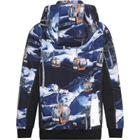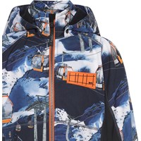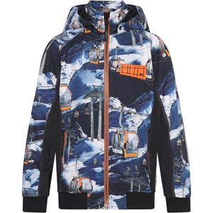 Cloudy er en sporty og vandtæt softshell jakke i blå med print af skilifte og med orange detaljer. Cloudy har aftagelig hætte, lynlås ned langs fronten, lommer i siden samt vindfang i ærmerne og elastisk kant i bunden. Molo's softshell jakker er et oplagt valg til overgangsperioderne, da ydermaterialet er vindtæt, vandtæt og åndbart, mens den indvendige fleece er recycled. Dette produkt har en vandafvisende PFC-fri imprægnering (indeholder f.eks. ikke PFOS, PFOA og lignende). Vandsøjletryk: 8.000 mm. Åndbarhed: 5.000 g/m2/24t.