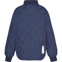 Quiltet, mørkeblå termojakke i 100% genanvendt polyester med sidelommer, ribkant ved hals og håndled samt skjult lynlås, der er dækket af en vindstolpe med praktiske trykknapper.