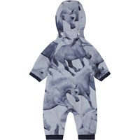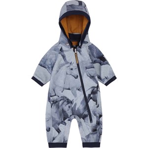 Hill er en funktionel og blød softshell dragt til babyer og det mindre barn. Heldragten er designet med et smukt hesteprint og med kontrastfarve på indersiden. Hill har aftagelig hætte, bløde ribafslutninger, refleks bagpå samt en lang lynlås foran, så det er nemt at iføre barnet dragten. Molo's softshell dragter er et oplagt valg til vuggestue/børnehave, da ydermaterialet er vindtæt, vandtæt og åndbart, mens den indvendige fleece er fremstillet af genanvendt polyester fra plastikflasker. Dette produkt har en vandafvisende PFC-fri imprægnering (indeholder f.eks. ikke PFOS, PFOA og lignende). Vandsøjletryk: 8.000 mm. Åndbarhed: 5.000 g/m2/24t. Sømmene er ikke tapede.