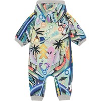 Funktionel softshell-dragt til babyer og mindre børn i delvist genanvendt polyester med et farverigt alloverprint, der er inspireret af en gammeldags pinball-maskine. Dragten har indvendig fleeceforing, en stjerneformet refleks på det ene ben, aftagelig hætte samt tætsluttende, grå ribkanter ved ærmer, ben og krave, der sikrer, at kold luft ikke trænger ind. Den praktiske, diagonale lynlås har hagebeskytter og fortsætter ned ad det ene ben, hvilket gør det nemt at tage dragten af og på.