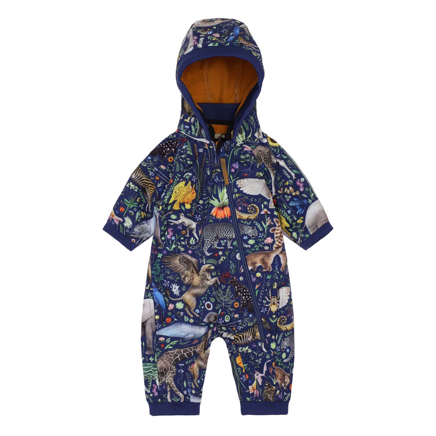 Hill er en funktionel og blød softshell dragt til babyer og det mindre barn. Heldragten er designet med et fantasifuldt dyreprint og med kontrastfarve på indersiden. Hill har aftagelig hætte, bløde ribafslutninger, refleks bagpå samt en lang lynlås foran, så det er nemt at iføre barnet dragten. Molo's softshell dragter er et oplagt valg til vuggestue/børnehave, da ydermaterialet er vindtæt, vandtæt og åndbart, mens den indvendige fleece er fremstillet af genanvendt polyester fra plastikflasker. Dette produkt har en vandafvisende PFC-fri imprægnering (indeholder f.eks. ikke PFOS, PFOA og lignende). Vandsøjletryk: 8.000 mm. Åndbarhed: 5.000 g/m2/24t. Sømmene er ikke tapede.