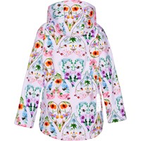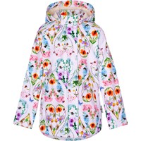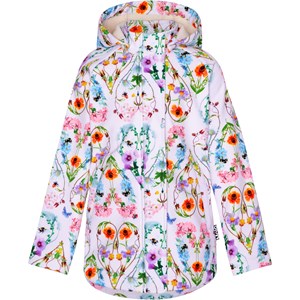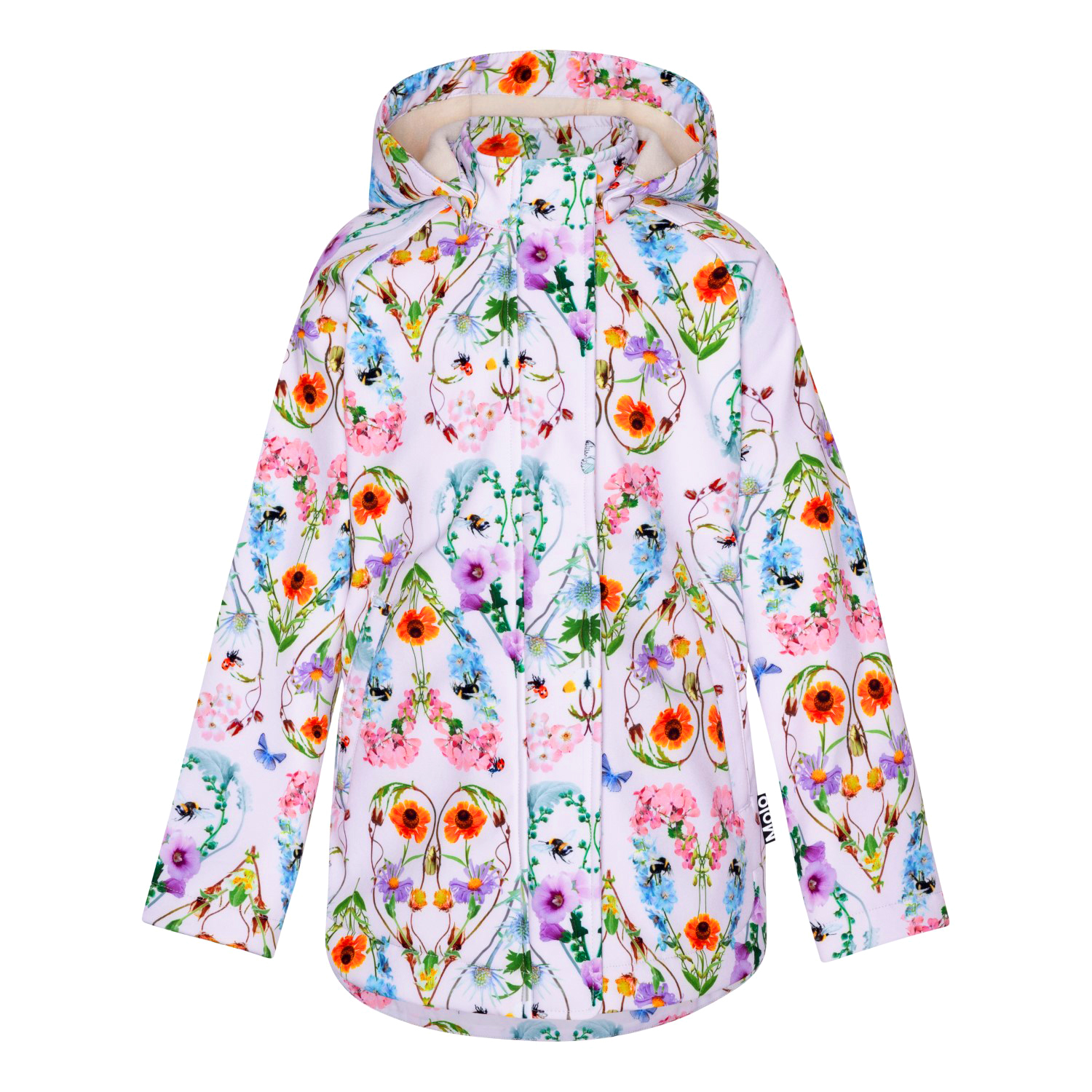 Funktionel, lyserød softshell-jakke i delvist genanvendt polyester med alloverprint af hjerteformede blomsterranker. Jakken har en frontlynlås med vindstolpe og hagebeskytter, aftagelig hætte, skrå lommer med lynlås i siderne samt en stor refleks på bagsiden. Indvendigt er der en blød fleeceforing samt elastik i taljen, så jakkens silhuet og pasform kan justeres.