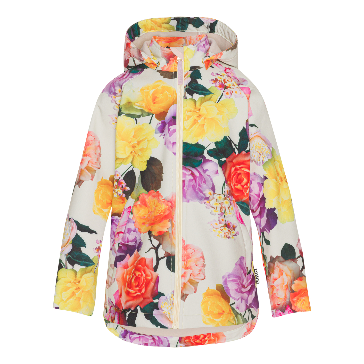 Hillary er en funktionel softshell jakke i grå med blomster print. Jakken har en praktisk længde med elastik i ryggen, hvilket giver en fin pasform. Der er aftagelig hætte, lynlås ned langs fronten, frontlommer, rib ved ærmeafslutning samt refleks bagpå. Molo's softshell jakker er et oplagt valg til overgangsperioderne, da ydermaterialet er vindtæt, vandtæt og åndbart. Produktet har en vandafvisende PFC-fri imprægnering (indeholder f.eks. ikke PFOS, PFOA og lignende). Vandsøjletryk: 8.000 mm. Åndbarhed: 5.000 g/m2/24t. Sømmene er ikke tapede.