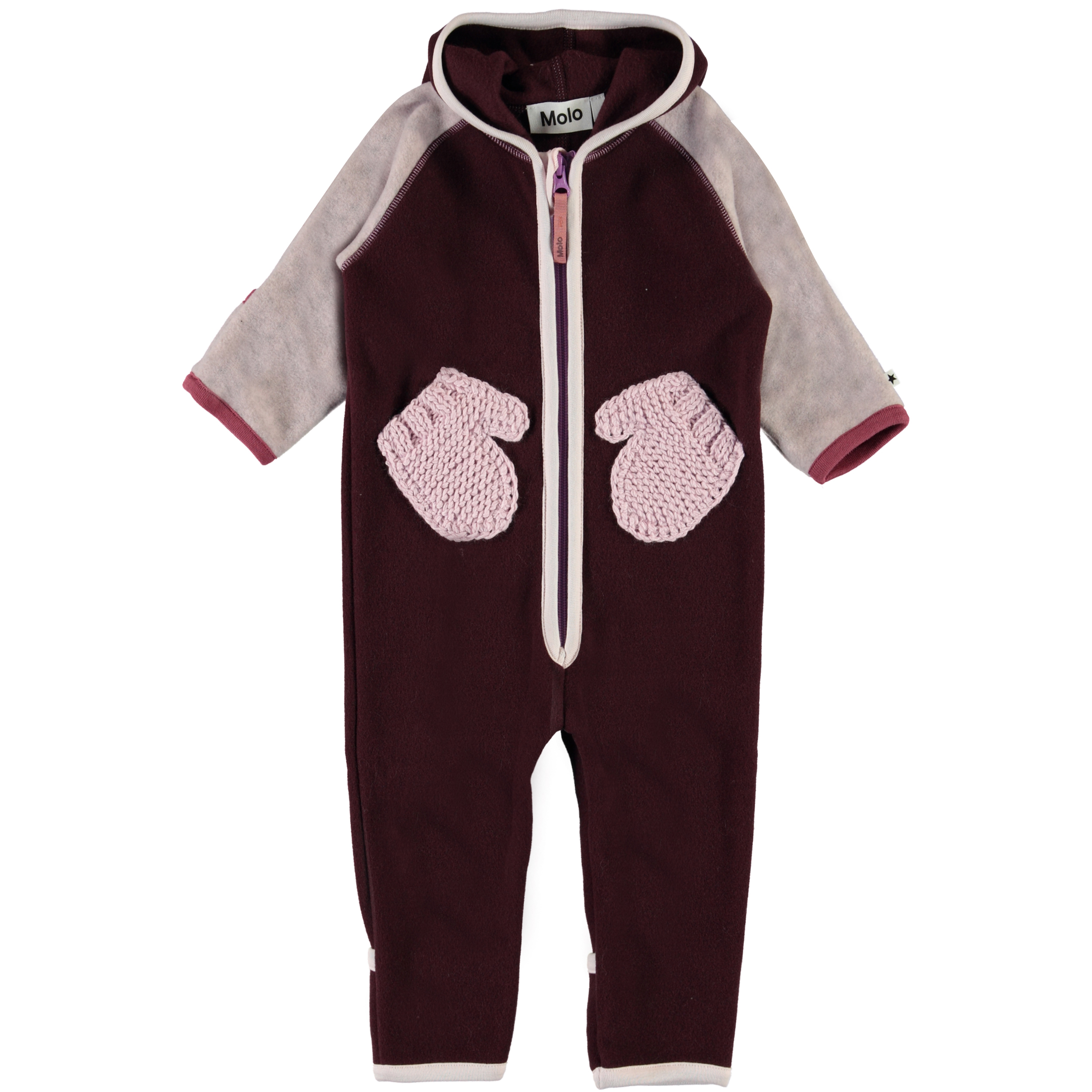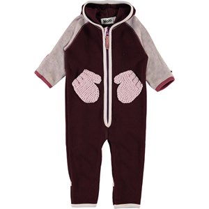 Udo er en baby fleecedragt i bordeaux med rosa ærmer og strikkede lommer, som ligner små handsker. Dragten har lynlåslukning og en hætte. Molo's fleecedragter varmer og virker isolerende. Brug den alene eller som et ekstra lag under flyverdragten på de meget kolde dage. Denne style vil være med fødder fra størrelse 56-74. Uden fødder fra størrelse 80-92.