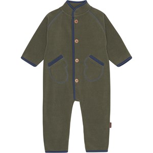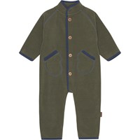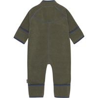 Mørkegrøn fleecedragt med mørkeblå kanter, handskeformede lommer og praktisk knappelukning på fronten. Fleecedragten varmer og virker isolerende, og den kan derfor bruges alene eller som et ekstra lag under flyverdragten på de koldeste dage. Denne style leveres med fødder fra størrelse 56-74 og uden fødder fra størrelse 80-92.