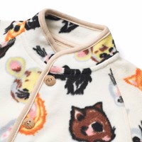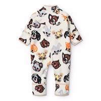 Hvid fleecedragt til de mindste i genanvendt polyester, med praktisk knappelukning på fronten og print af søde dyr fra gamle tegnefilm. Dragten er blød, har en normal pasform og fungerer godt både alene og som et ekstra lag under en flyverdragt.