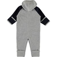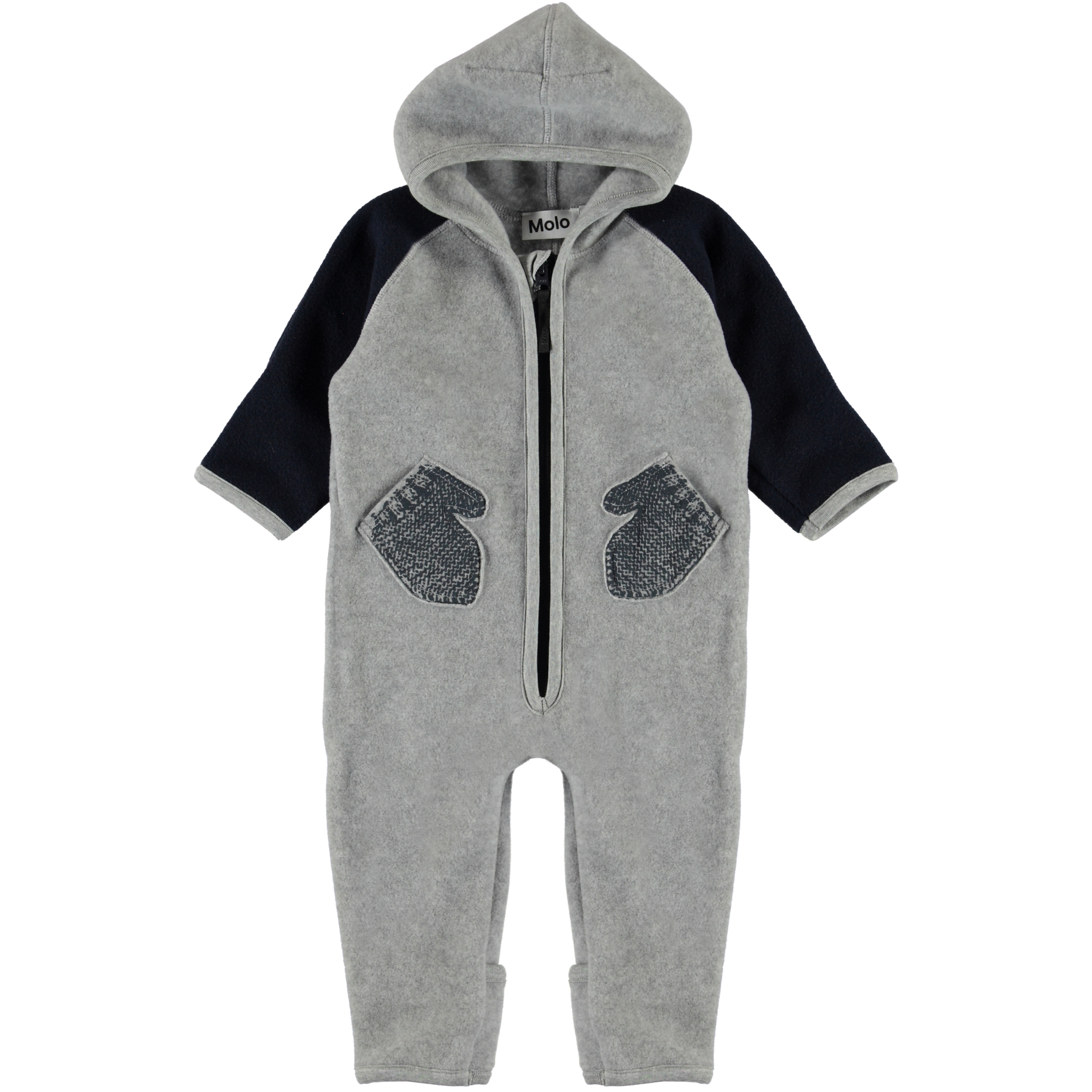 Udo er en baby fleecedragt i grå med sorte ærmer og grå strikkede lommer, som ligner små handsker. Dragten har lynlåslukning og en hætte. Molo's fleecedragter varmer og virker isolerende. Brug den alene eller som et ekstra lag under flyverdragten på de meget kolde dage. Denne style vil være med fødder fra størrelse 56-74. Uden fødder fra størrelse 80-92.