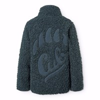Mørkeblå fleecejakke i genanvendt polyester med flot ryg patch i slidstærkt nylon. Jakken har et glat bomulds foer, brune ribkanter, høj krave, lynlåslukning samt hul til tommelfingeren.