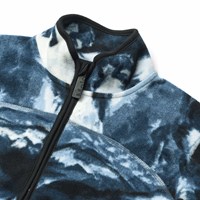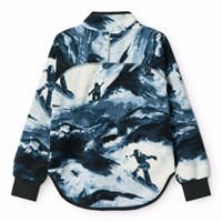 Fleecejakke i genanvendt polyester med ribkanter og et kunstnerisk print af snowboarder i alperne i blå og hvide nuancer. Jakken har en høj krave, lynlåslukning, frontlomme og et forlænget snit bagtil. Den er blød, har en normal pasform og fungerer både godt alene eller som et ekstra lag under en jakke.