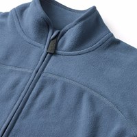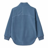Blå fleecejakke i genanvendt polyester med matchende ribkanter. Jakken har en høj krave, lynlåslukning, frontlomme og et forlænget snit bagtil. Den er blød, har en normal pasform og fungerer både godt alene eller som et ekstra lag under en jakke.