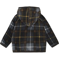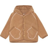 Uli er en brun ternet baby fleece jakke med hætte. Jakken har lyse stikninger, handske formede front lommer og knappelukning på fronten.