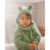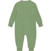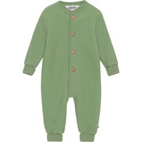 Grøn babyheldragt i blød fleece-kvalitet af 100 % merinould. Sparkedragten er særdeles velegnet som overtøj, når der skal gås tur i eller soves i barnevognen i de kolde efterårs- og vintermåneder. Dragten kan med fordel også benyttes indendørs, hvis der er gulvkoldt. Den har en rummelig pasform med knapper langs fronten og tætsluttende ribkanter med opsmøg ved ben- og ærmegab.