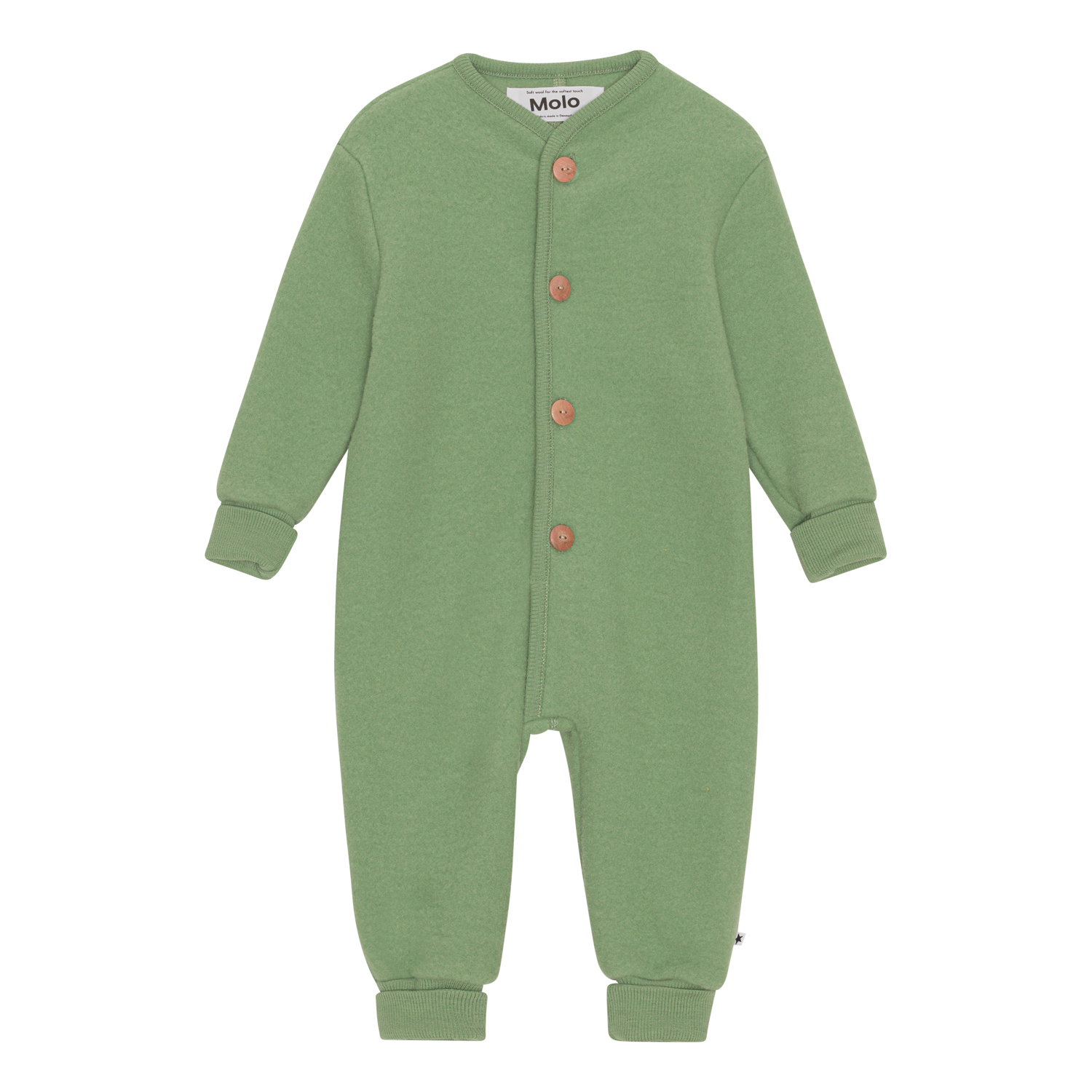 Grøn babyheldragt i blød fleece-kvalitet af 100 % merinould. Sparkedragten er særdeles velegnet som overtøj, når der skal gås tur i eller soves i barnevognen i de kolde efterårs- og vintermåneder. Dragten kan med fordel også benyttes indendørs, hvis der er gulvkoldt. Den har en rummelig pasform med knapper langs fronten og tætsluttende ribkanter med opsmøg ved ben- og ærmegab.