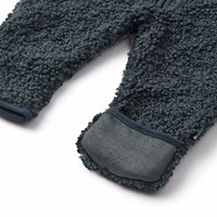 Mørkeblå fleecedragt til de mindste i genanvendt polyester med blødt bomulds foer. Dragten har praktisk lynlåslukning, hætte med påsyede små bamseører, matchende ribkanter og kan bruges alene eller som et ekstra lag under flyverdragten.